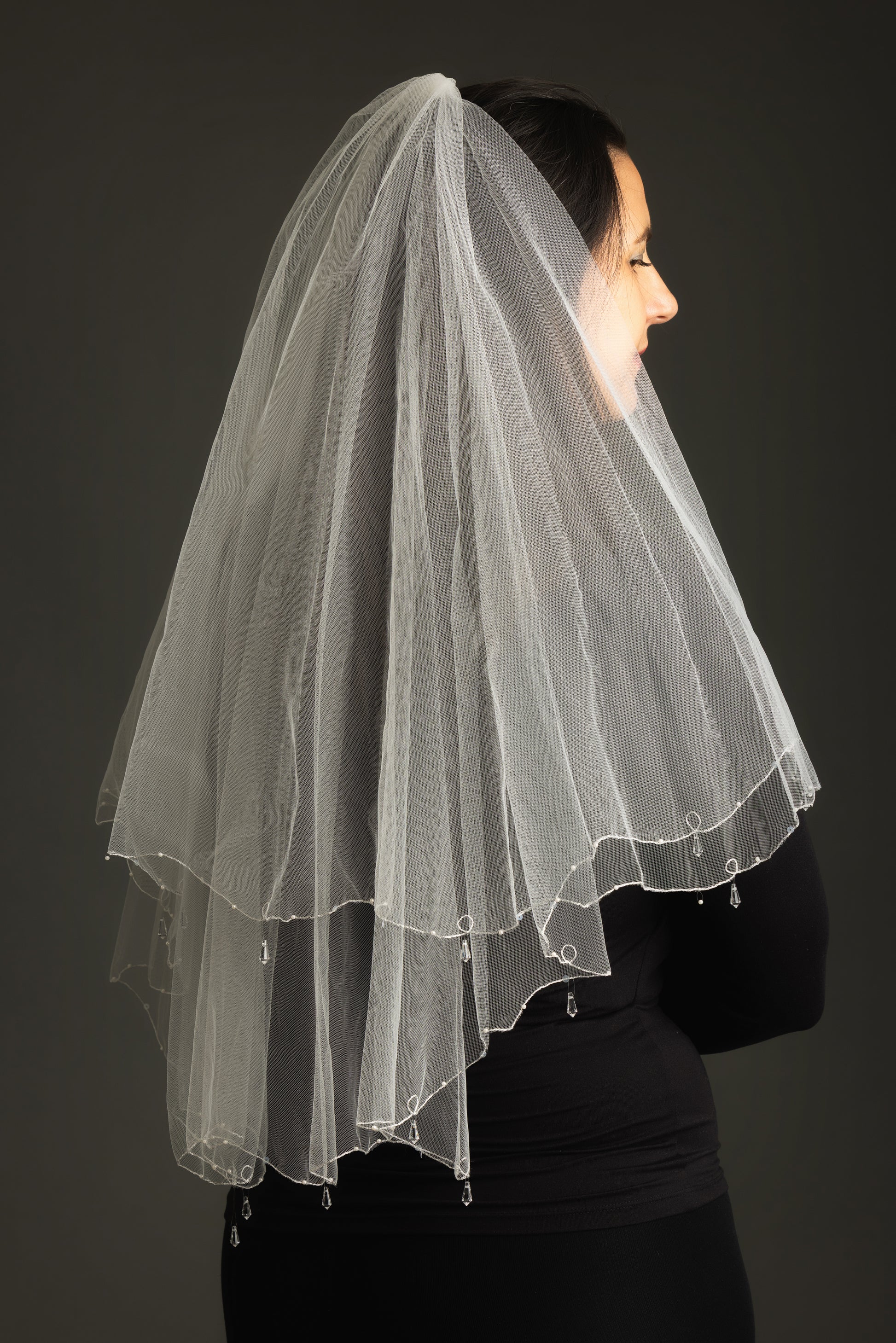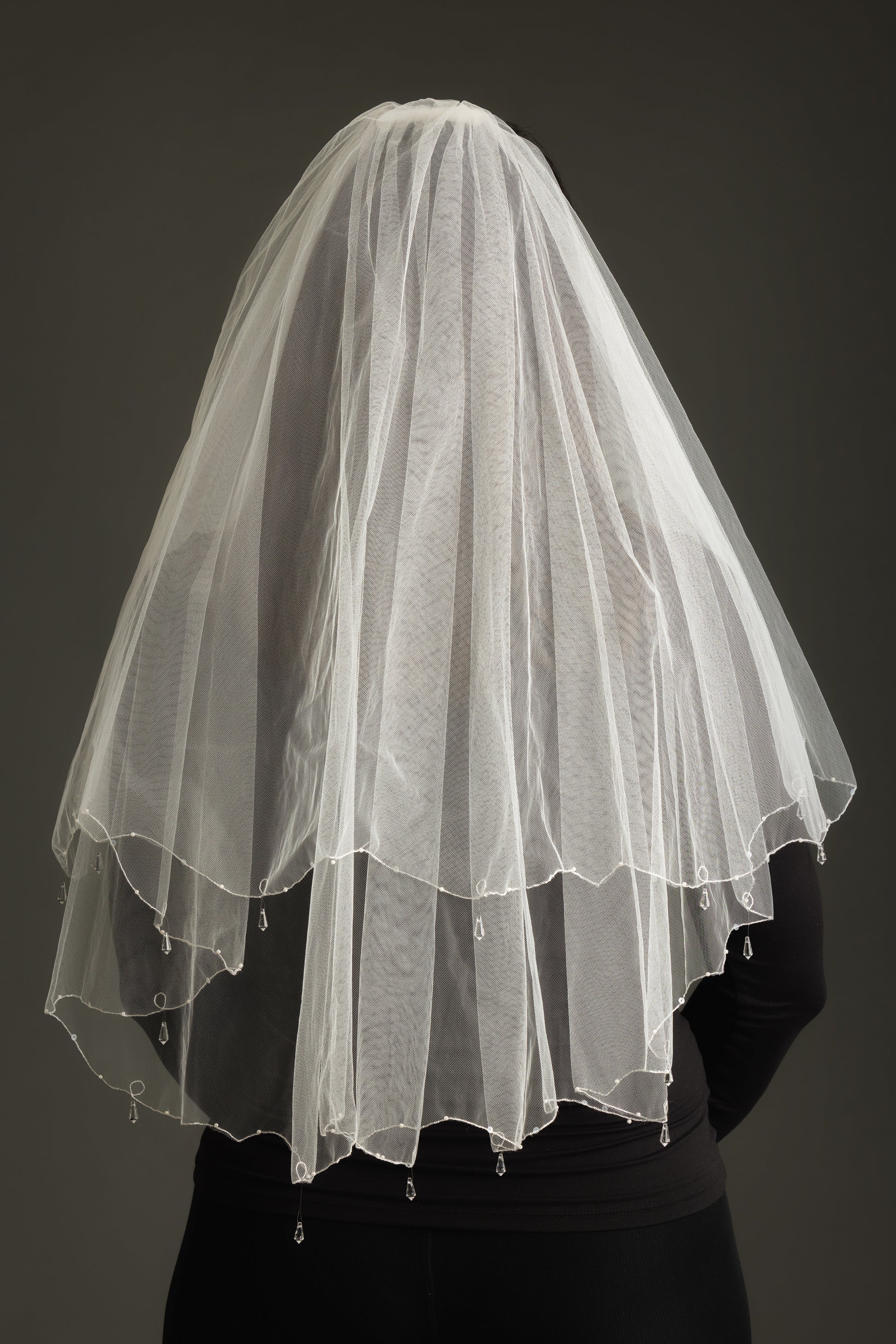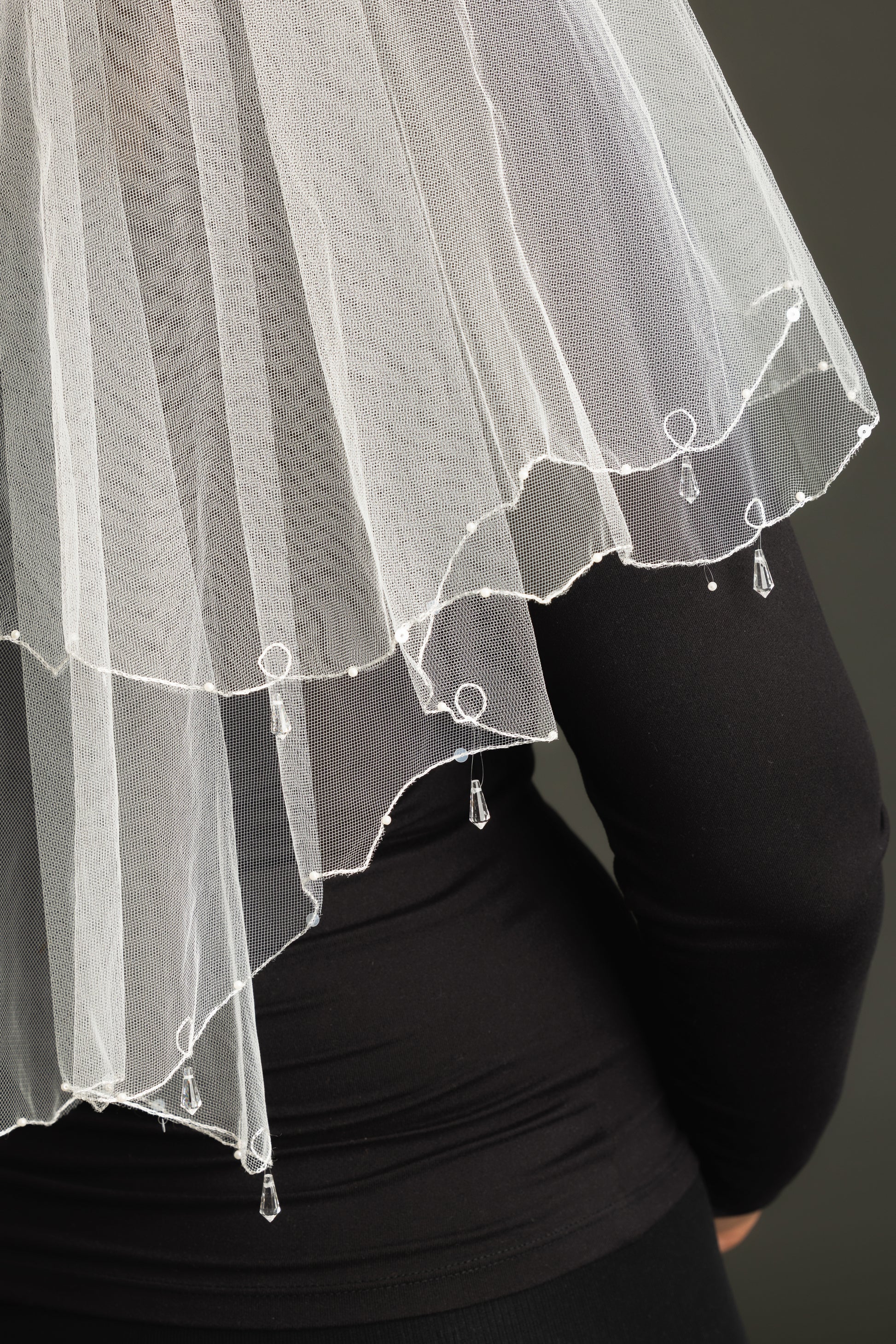 Two-tiered veil with a delicate thin embroidered edge that outlines the veil's hem. Along the edge are intermittent little pearls and sequins and at the loop of stitches is a beautiful crystal to glisten when the light catches it.